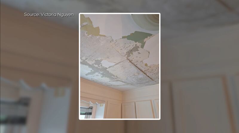 “It happened right in front of my eyes because I was feeding my baby,” Nguyen explained. “Suddenly, without any notice at all, [the ceiling] collapsed. It was loud, surprisingly. It was heavy. The drywall went down and it nearly missed my father.”