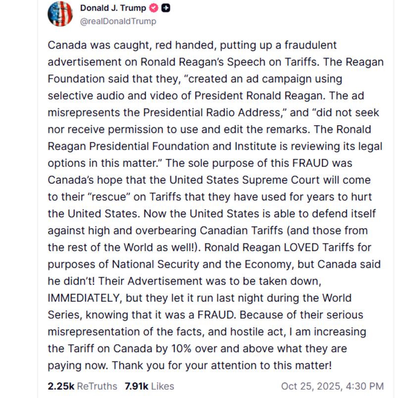 The ad features footage of former president Ronald Reagan warning about the economically devastating effects of tariffs. lt was shown again during the broadcast of the World Series on Friday night where the Toronto Blue Jays defeated the Los Angeles Dodgers.