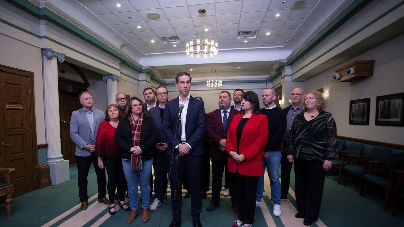 Surrounded by most of his caucus, John Hogan spoke to reporters on Tuesday for the first time since the Liberals were booted from power and reduced to Official Opposition in the Oct. 14 election. The Progressive Conservatives won a slim majority in a result that shocked many in the province.