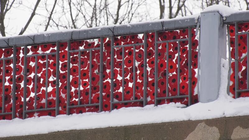 This year, 11,700 poppies were collected. Many of them can be found hanging from the Waterloo Street bridge.