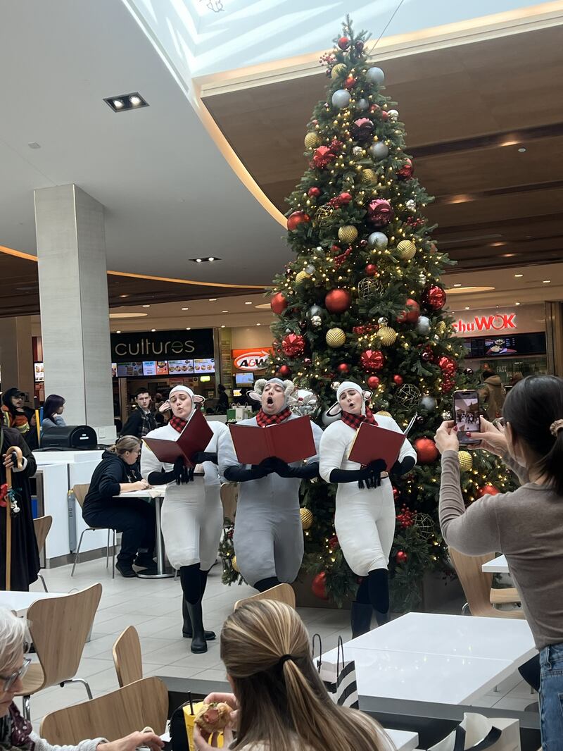 A TikTok video of a trio dressed up as sheep singing Christmas carols, surprising and bewildering mall strollers and shoppers at Upper Canada Mall in late November, has gone viral. The group can be seen dressed in sheep costumes, complete with ears, hooves, and even stuffed bodysuits to create the appearance of fluffy wool, singing Christmas carols and carrying out other theatrical antics.