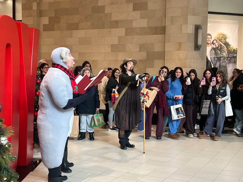 But this isn’t your standard get-up-and-sing choir. It’s more of an immersive experience where the sheep stay in character at all times, baa-ing, chewing, and sometimes wandering off or getting into trouble as they walk through the mall, said the musical director for the group, Anika Johnson.