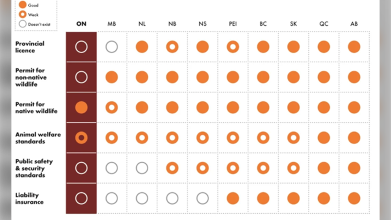 The experts at World Animal Protection say Ontario ranks last among Canadian provinces to address captive wildlife issues, including implementing a zoo-licencing system, a permit system for non-native species, a public safety and security standards or a requirement for liability insurance for operators.