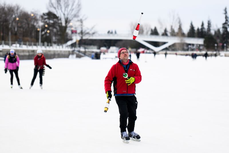 Rideau Canal Skateway 2025-2026 Mike Adams juggles as he skates along the Rideau Canal Skateway during the first official day of public skating on New Year’s Eve on Wednesday, Dec. 31, 2025. The Rideau Canal is a UNESCO World Heritage Site. THE CANADIAN PRESS/Spencer Colby