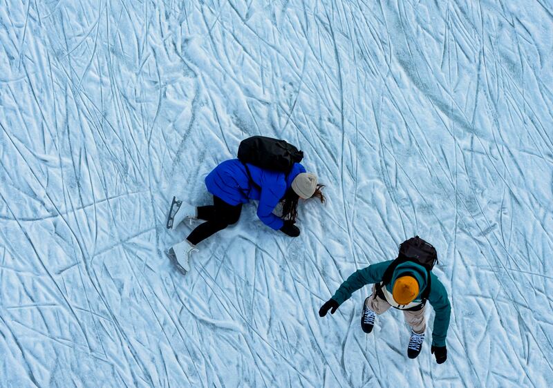 Rideau Canal Skateway in Ottawa, 2026 A skater falls on the Rideau Canal Skateway after the ice surface deteriorated with the day's warm temperature, during the final weekend of Winterlude, in Ottawa, on Saturday, Feb. 14, 2026. THE CANADIAN PRESS/Justin Tang