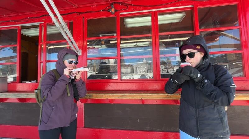 Beavertail Dale and Nancy Duncan have a BeaverTail and hot chocolate on the Rideau Canal Skateway. March 2, 2026. (Camille Wilson/CTV News Ottawa)