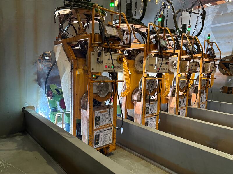 The speed at which Hanwha can build is made possible through its automated production line. The shipyard which employs 31,000 people is able to produce 45 commercial and naval vessels in a year. Robot welders are watched over by human supervisors holding tablets, programming their every move. Some of the robots are the size of a Roomba, others the height of a high school locker. Tour guides said that only 10 per cent of the welding at Hanwha is done by human hands.