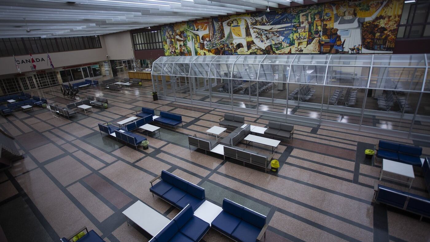 Other distinctive features include floor-to-ceiling windows that provide panoramic views of the runways, and a 22-metre-wide mural by Canadian painter Kenneth Lochhead. Called “Flight and Its Allegories,” which depicts the story of human flight.