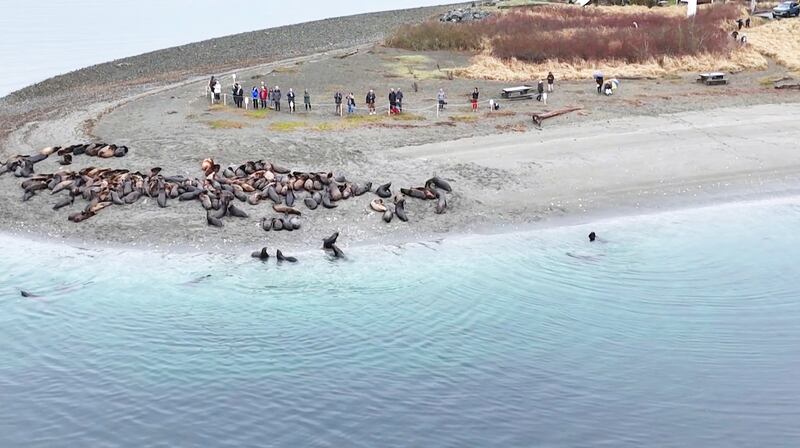 Hundreds of California sea lions have hauled themselves onto a small beach in Deep Bay, B.C., feasting on herring and creating a raucous scene that can be heard long before it’s seen.