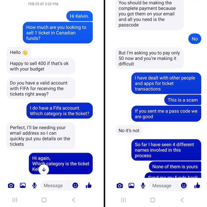 Ibrahim agreed to pay half up front and then pay the remainder of the once the tickets arrived in his online FIFA account. However, the tickets never came.