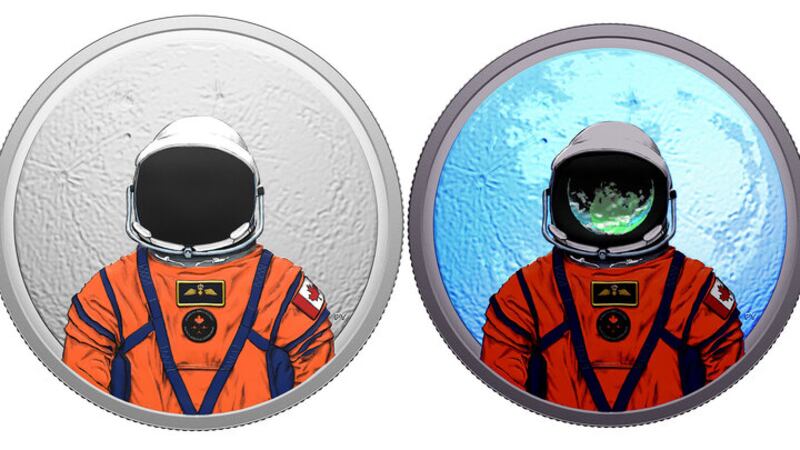 The coin shows Hansen, one of the astronauts on the historic moon mission, in the blue-trimmed, orange-coloured Orion Crew Survival System (OCSS) spacesuit.