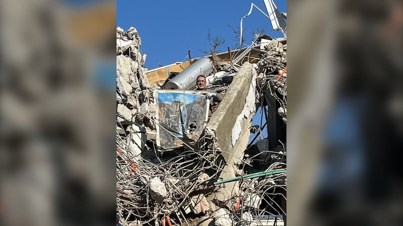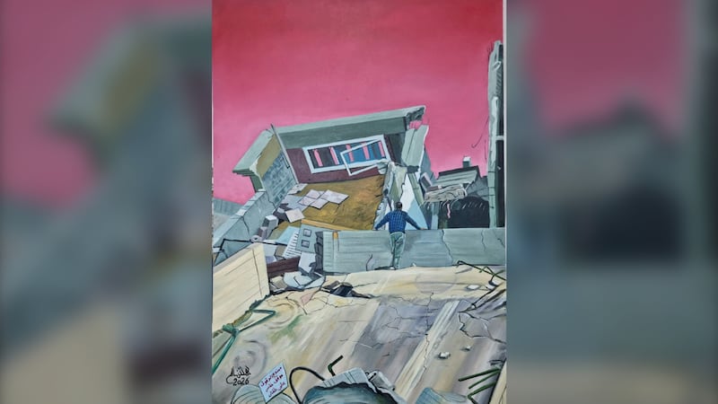 But in that time, he’s also been creating new paintings. His most recent and one of his proudest pieces of work: a recreation of a picture of him standing in front of the ruins of his old home that was destroyed more than a year ago.