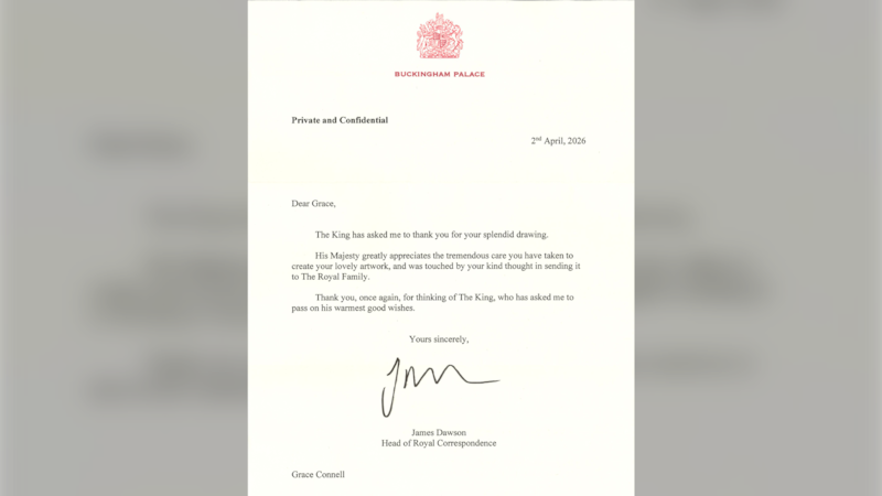 “The King has asked me to thank you for your splendid drawing,” the letter dated April 2 reads. “His Majesty greatly appreciates the tremendous care you have taken to create your lovely artwork, and was touched by your kind thought in sending it to the Royal Family.”