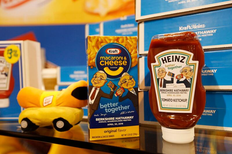 Two figures who didn’t split, though? Buffett and Munger, who are seen here on a bottle of Heinz ketchup and Kraft macaroni and cheese.
