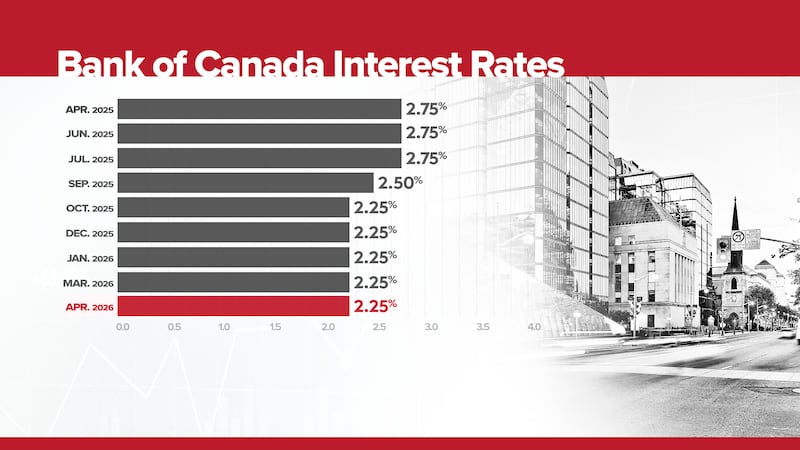 OTTAWA — The Bank of Canada is holding its key policy interest rate at 2.25 per cent for the fourth consecutive time as it warns of higher inflation for the short term.