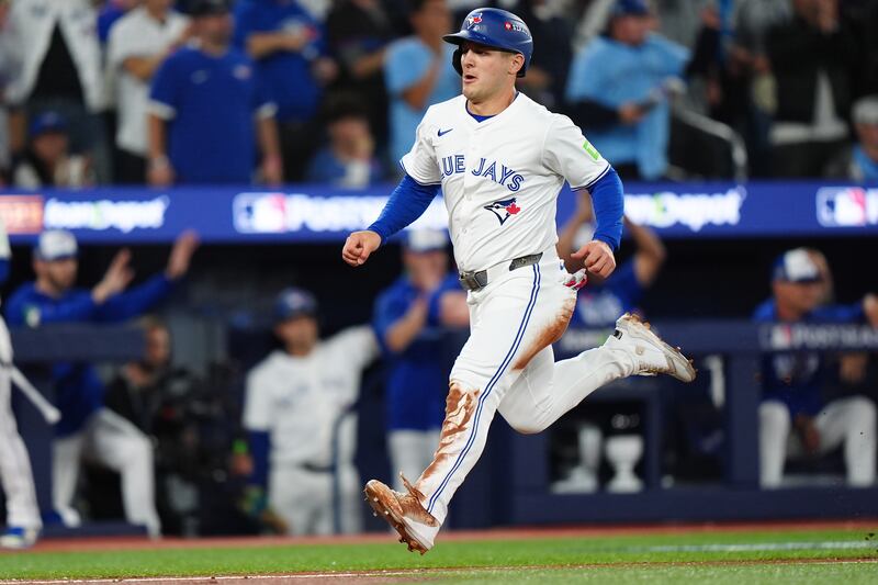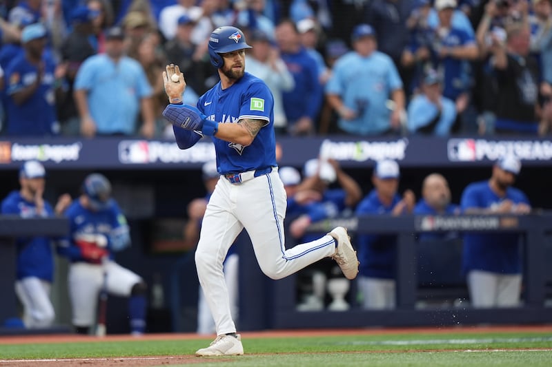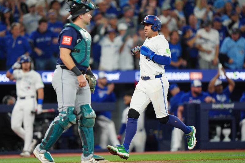 Varsho comes in to score Toronto Blue Jays' Daulton Varsho (5) runs home to score against the Seattle Mariners during second inning MLB American League Championship Series game 6 baseball action in Toronto, Sunday, Oct. 19, 2025.