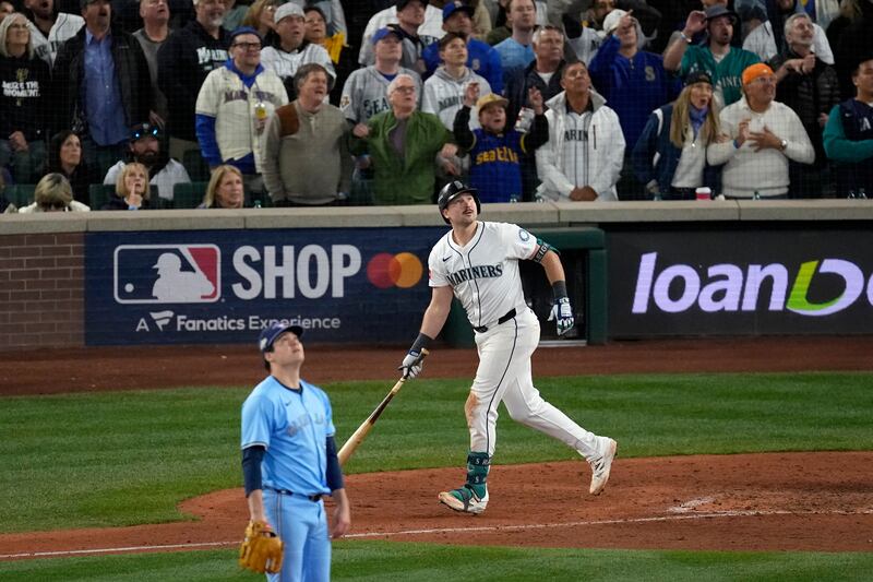 Raleigh ties the game with a solo home run Seattle Mariners' Cal Raleigh watches his solo home run take flight as Toronto Blue Jays pitcher Brendon Little looks on during the eighth inning in Game 5 of baseball's American League Championship Series, Friday, Oct. 17, 2025, in Seattle.