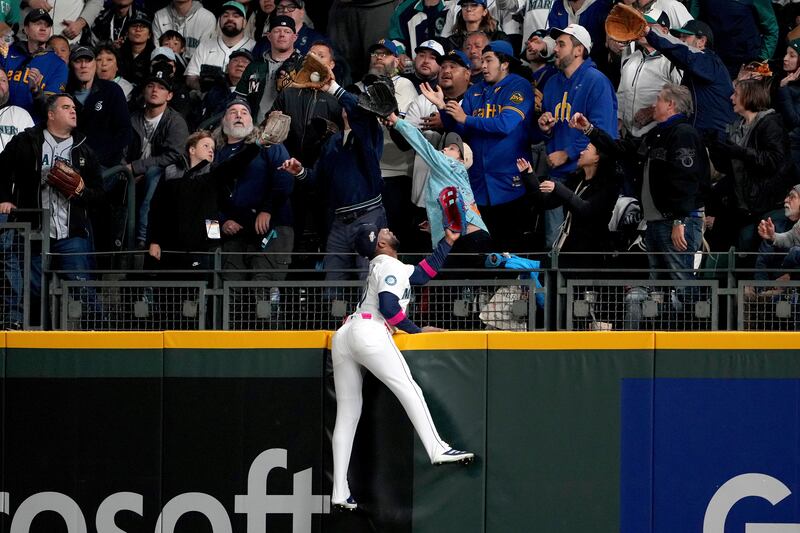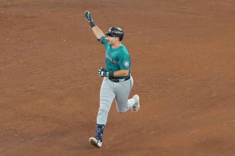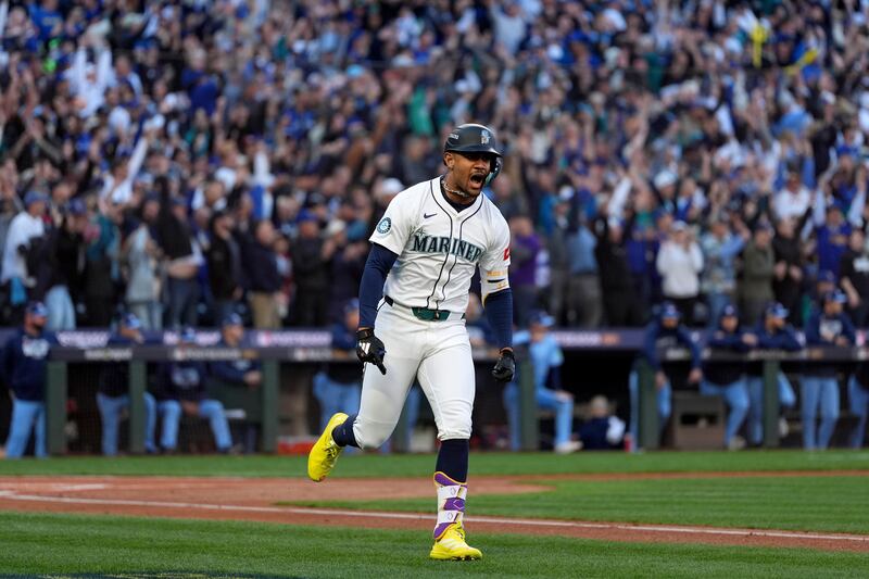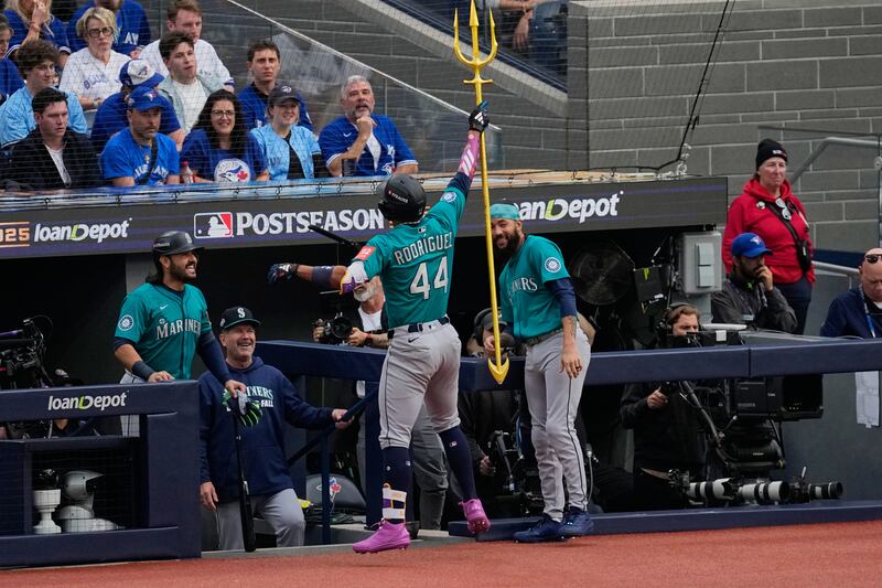 Julio Rodríguez's three-run homer Seattle Mariners' Julio Rodríguez celebrates with the trident after hitting a three-run home against the Toronto Blue Jays during the first inning in Game 2 of baseball's American League Championship Series, Monday, Oct. 13, 2025, in Toronto. (AP Photo/David J. Phillip)