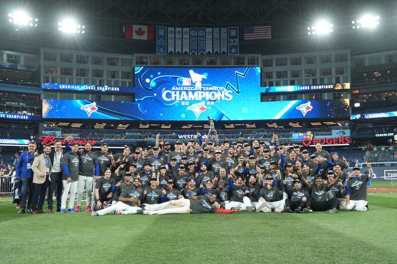 The ALCS champions The Toronto Blue Jays pose for a team photo as they celebrate after defeating the Seattle Mariners in MLB American League Championship Series game 7 baseball action in Toronto, Monday, Oct. 20, 2025. THE CANADIAN PRESS/Nathan Denette