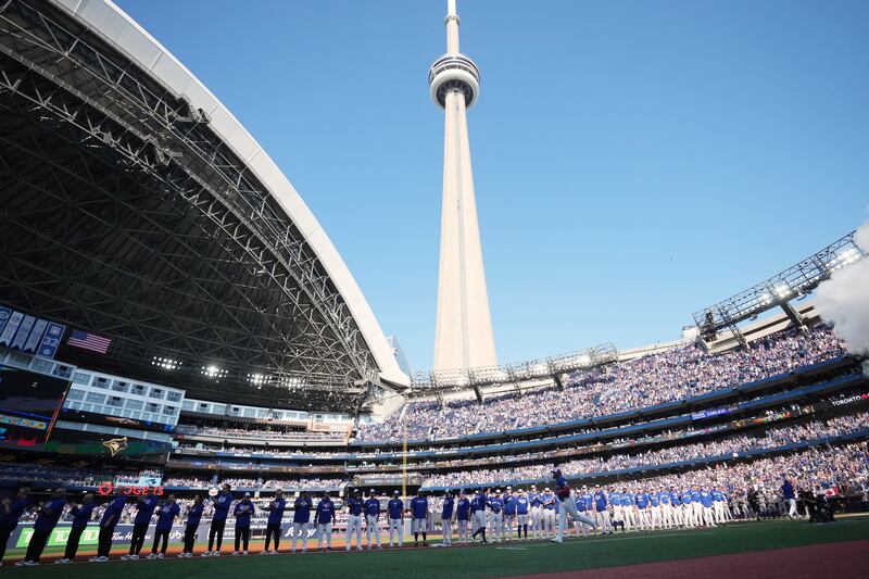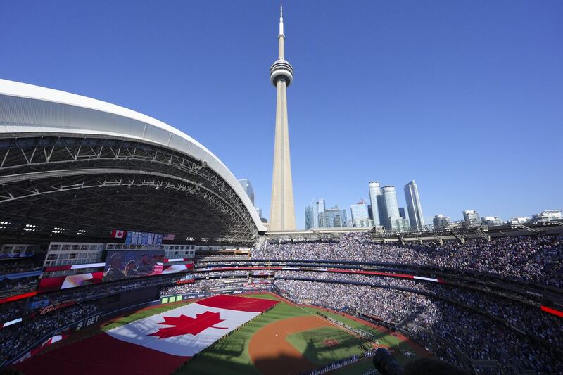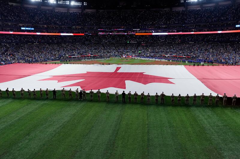 Canadian flag on the field for national anthem The Canadian flag is displayed on the field prior to Game 1 of baseball's American League Championship Series between the Toronto Blue Jays and the Seattle Mariners, Sunday, Oct. 12, 2025, in Toronto.