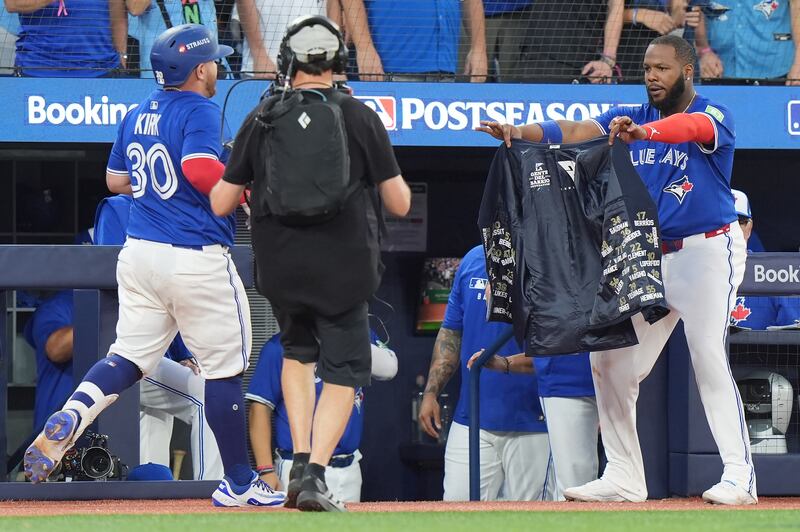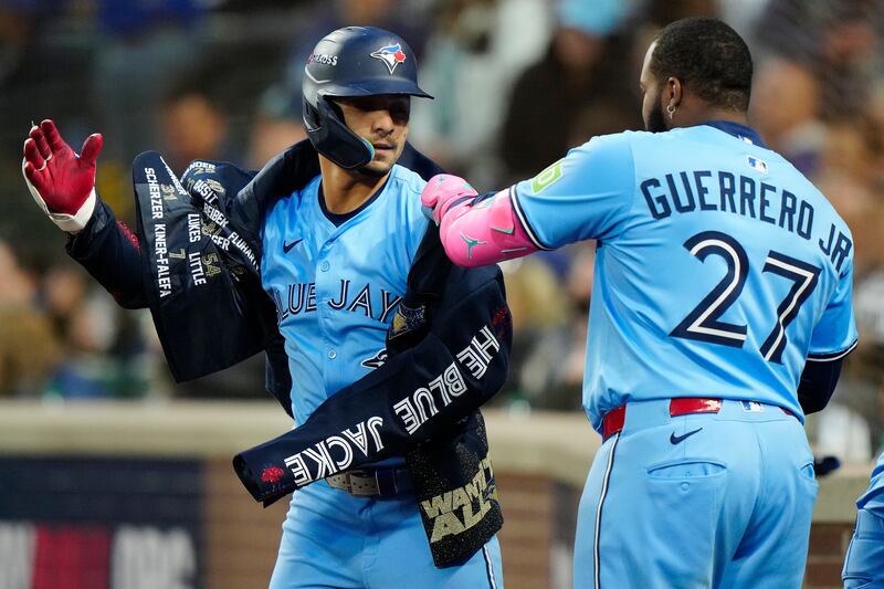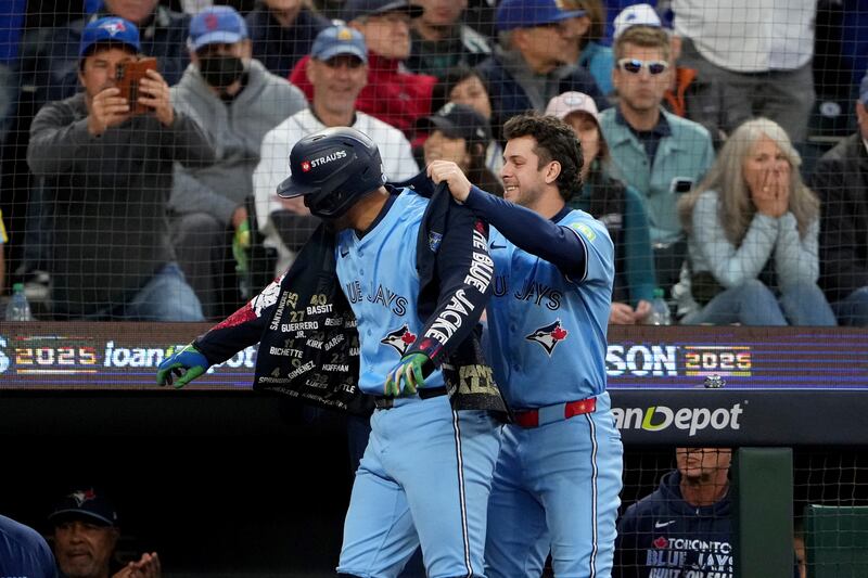 Giménez celebrates his home run Toronto Blue Jays first base Vladimir Guerrero Jr. (27) puts the home run jacket on teammate Andrés Giménez (0) after his two run home run during third inning MLB American League Championship Series game 4 baseball action against the Seattle Mariners, in Seattle, Thursday, Oct. 16, 2025.