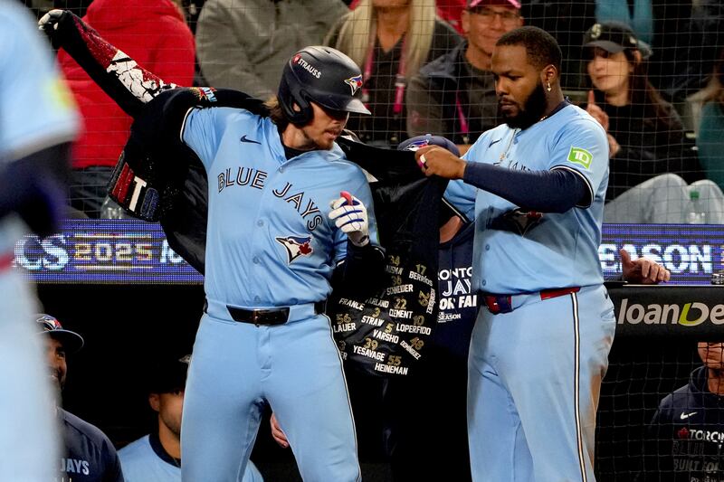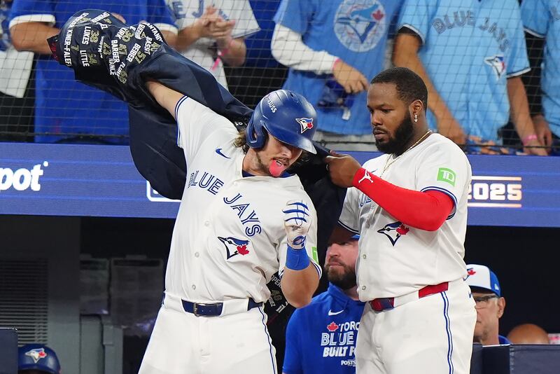 Barger hits big homer Toronto Blue Jays' Addison Barger (47) celebrates with Vladimir Guerrero Jr. after hitting a two-run home run against the Seattle Mariners during third inning MLB American League Championship Series game 6 baseball action in Toronto, Sunday, Oct. 19, 2025.
