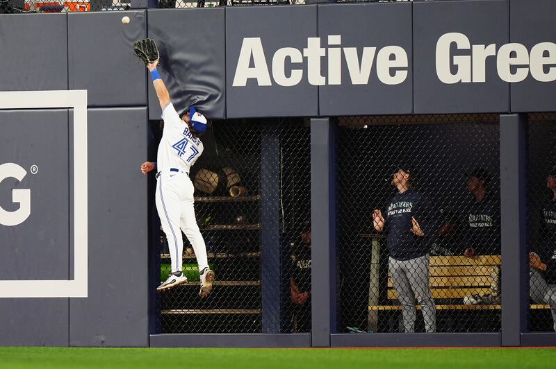 Barger narrowly misses big hit Toronto Blue Jays right fielder Addison Barger (47) tries to catch a ball off the wall on a single by Seattle Mariners' Leo Rivas (not shown) during third inning MLB American League Championship Series game 6 baseball action in Toronto, Sunday, Oct. 19, 2025.