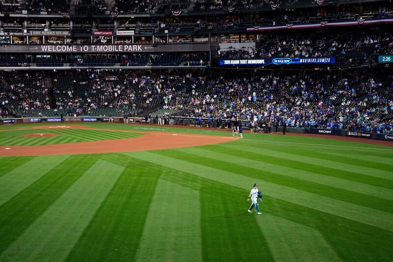 ALCS Game 5 begins Seattle Mariners catcher Cal Raleigh walks to the bullpen prior to Game 5 of baseball's American League Championship Series against the Toronto Blue Jays, Friday, Oct. 17, 2025, in Seattle. (AP Photo/David J. Phillip)