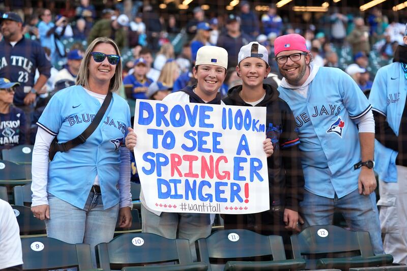 Blue Jays fans go wild after Springer's homer Toronto Blue Jays fans react after the team scored against the Seattle Mariners to win the American League Championship Series, in Toronto, Monday, Oct. 20, 2025.