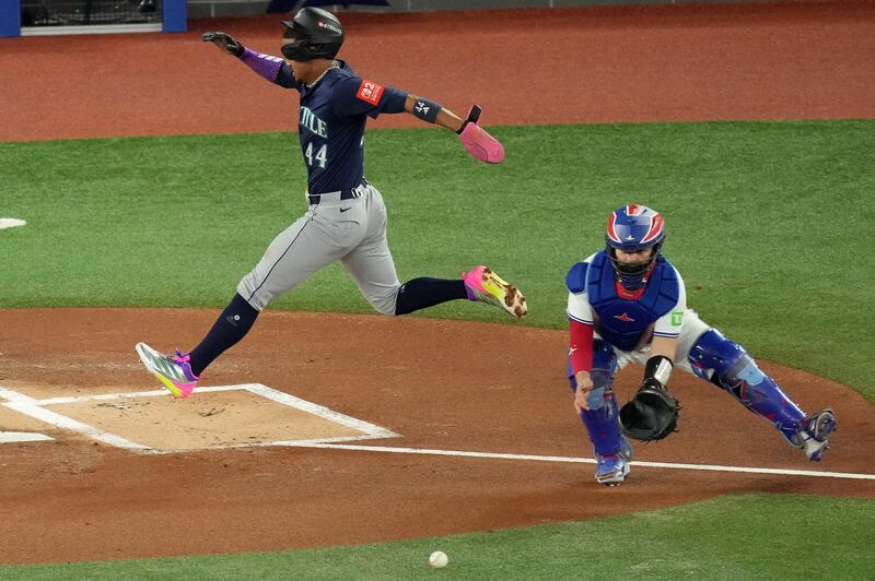 Rodríguez gets the Mariners on the board first Seattle Mariners outfielder Julio Rodríguez (44) scores in front of Toronto Blue Jays catcher Alejandro Kirk (30) on an RBI single from teammate Josh Naylor (12) during first inning MLB American League Championship Series game 7 baseball action in Toronto, Monday, Oct. 20, 2025.