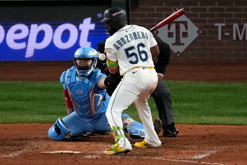 Arozarena gets hit by a pitch Seattle Mariners' Randy Arozarena is hit by a pitch during the eighth inning in Game 5 of baseball's American League Championship Series against the Toronto Blue Jays, Friday, Oct. 17, 2025, in Seattle.