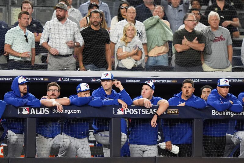 ALDS Blue Jays Yankees Baseball The Toronto Blue Jays watch from the dugout against the New York Yankees in the ninth inning of Game 3 of baseball's American League Division Series, Tuesday, Oct. 7, 2025, in New York. (AP Photo/Frank Franklin II)