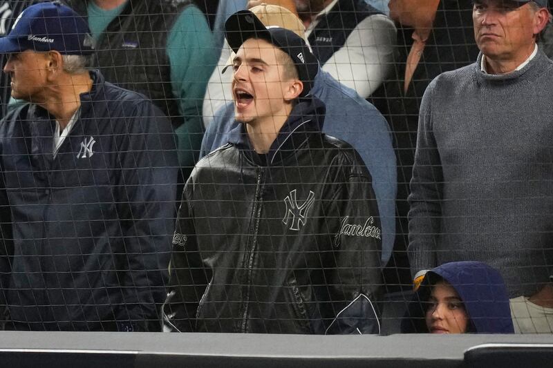Timothee Chalamet and Kylie Jenner watch on Timothee Chalamet, center, reacts while watching Game 4 of baseball's American League Division Series between the New York Yankees and the Toronto Blue Jays, Wednesday, Oct. 8, 2025, in New York.