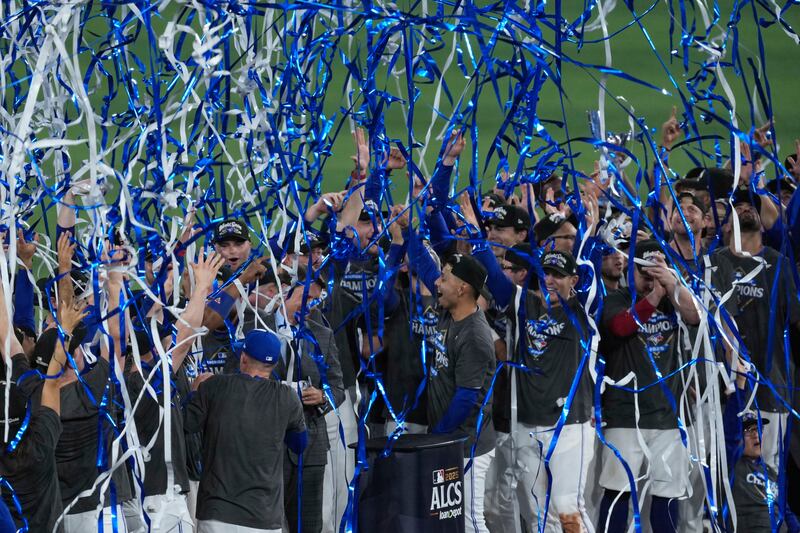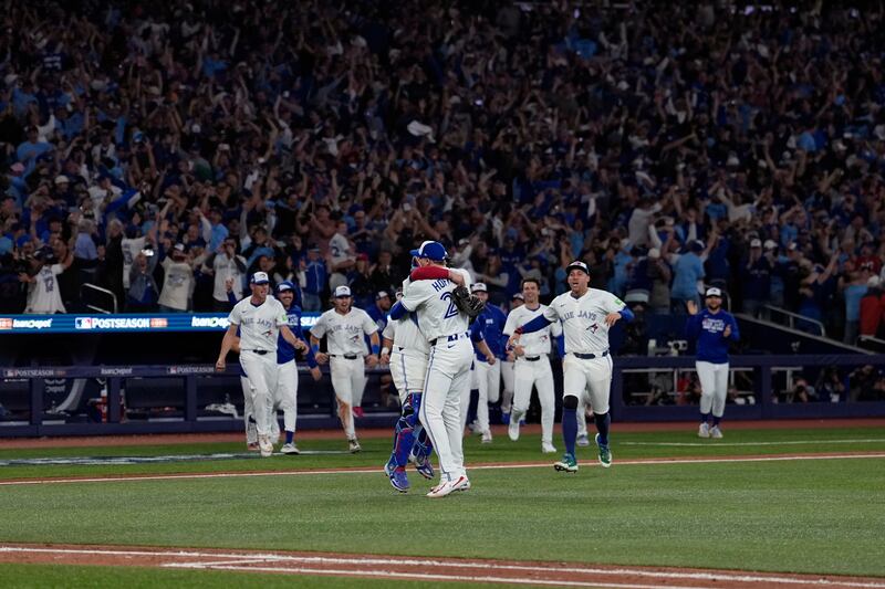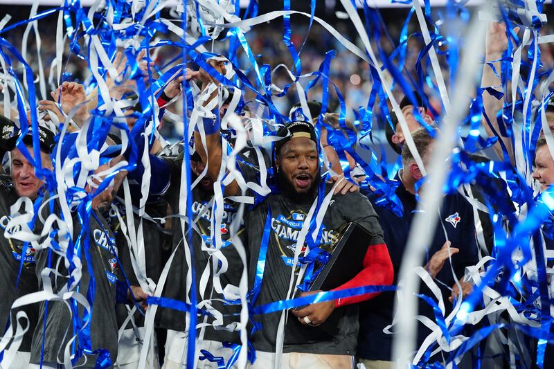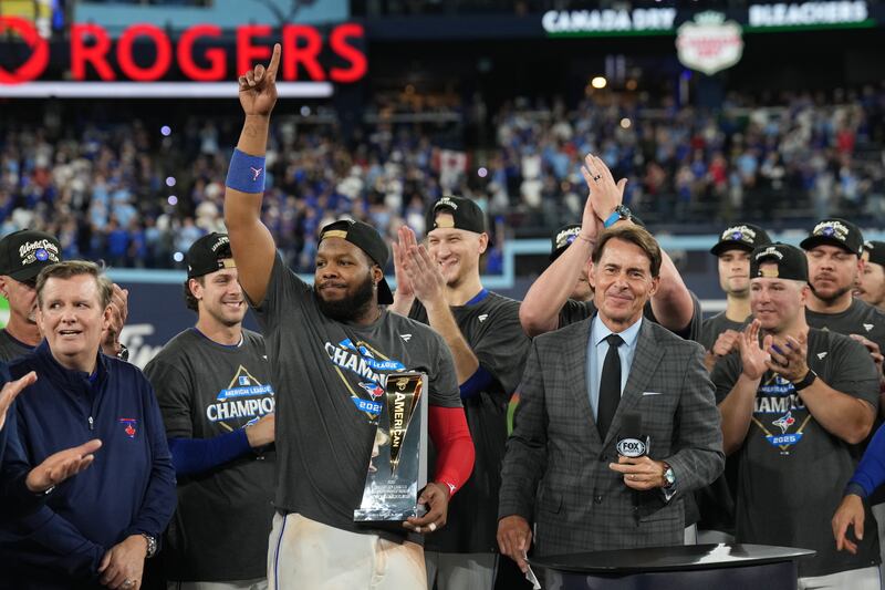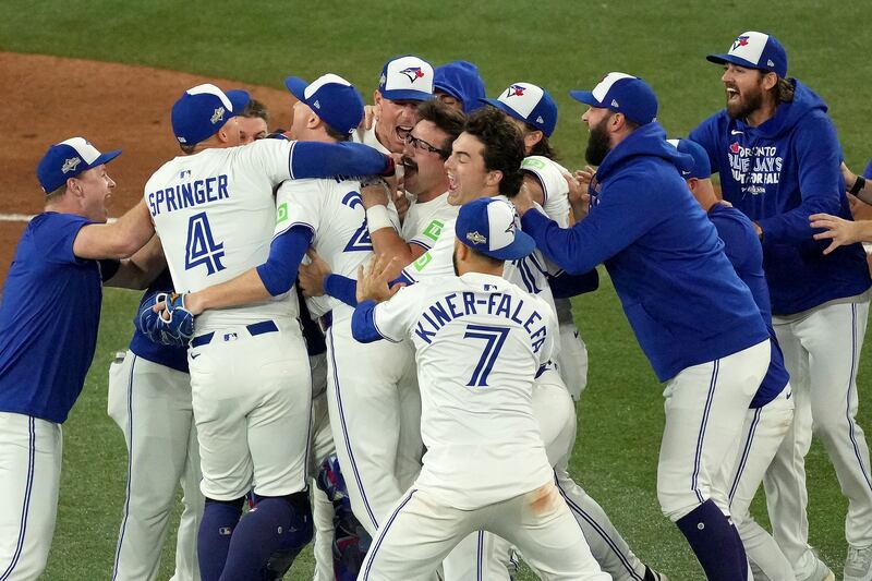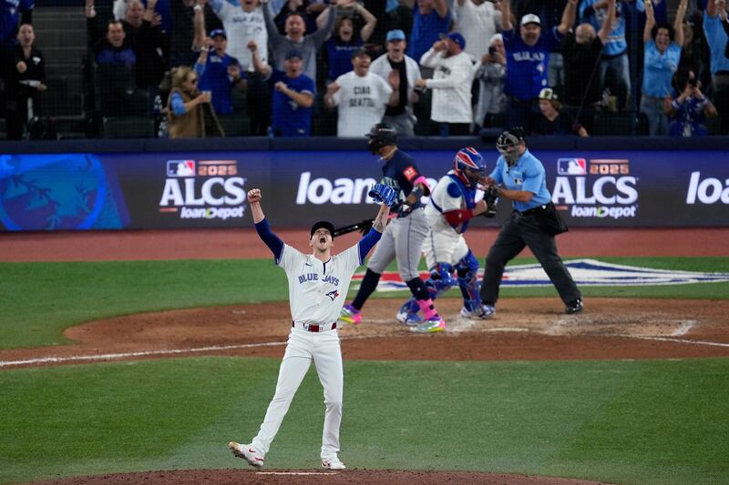 Blue Jays win the American League pennant The Toronto Blue Jays celebrate after Game 7 of baseball's American League Championship Series against the Seattle Mariners, Monday, Oct. 20, 2025, in Toronto.
