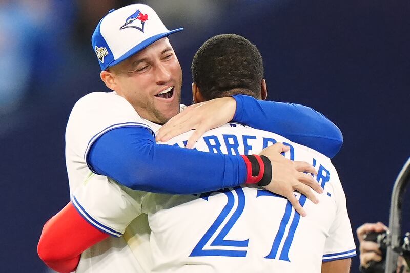 Springer and Guerrero Jr. hug after the Game 7 win Toronto Blue Jays' George Springer, left, and Vladimir Guerrero Jr. celebrate after defeating the Seattle Mariners in MLB American League Championship Series game 7 baseball action in Toronto, Monday, Oct. 20, 2025.