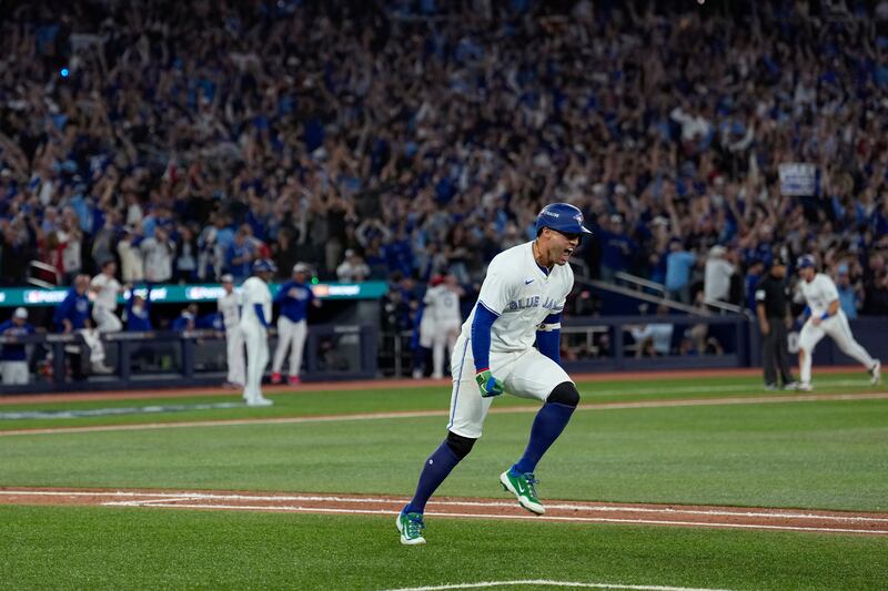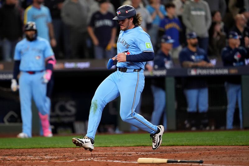 Barger scores on the Springer double Toronto Blue Jays' Addison Barger scores on an double hit by George Springer during the fifth inning in Game 5 of baseball's American League Championship Series against the Seattle Mariners, Friday, Oct. 17, 2025, in Seattle.