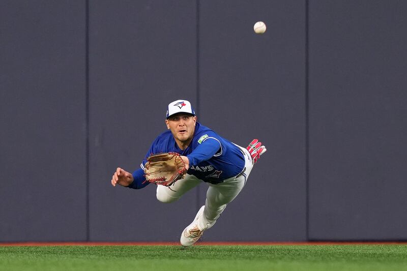 Varsho dives Toronto Blue Jays outfielder Daulton Varsho (5) makes a catch to out Seattle Mariners third baseman Eugenio Suárez (28) during third inning MLB American League Championship Series game 2 baseball in Toronto, Monday, Oct. 13, 2025. THE CANADIAN PRESS/Nathan Denette