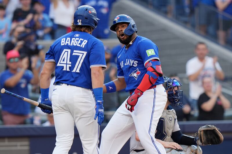 Toronto Blue Jays' Vladimir Guerrero Jr. Toronto Blue Jays' Vladimir Guerrero Jr. (27) celebrates with Addison Barger (47) after hitting a home run during the first inning of game 1 in MLB American League Division Series baseball action against the New York Yankees in Toronto on Saturday, October 4, 2025. THE CANADIAN PRESS/Frank Gunn/Frank Gunn