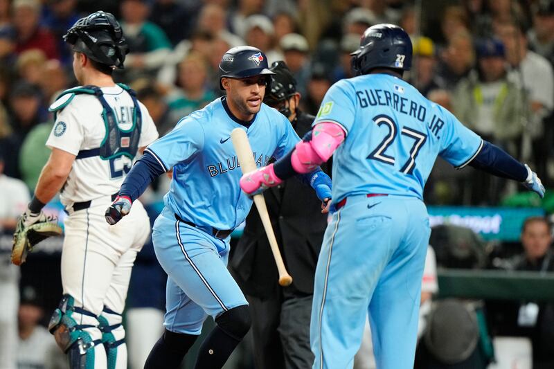 Guerrero hypes up Springer Toronto Blue Jays outfielder George Springer (4) celebrates scoring on a wild pitch with teammate Vladimir Guerrero Jr. (27) during fourth inning MLB American League Championship Series game 4 baseball action against the Seattle Mariners, in Seattle, Thursday, Oct. 16, 2025.