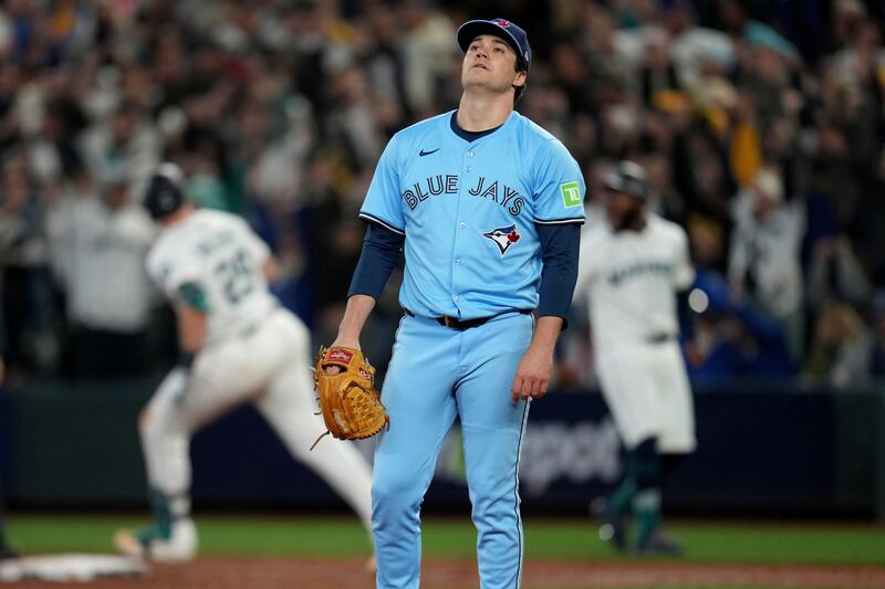 Little comes into the game and gives up the tying run Toronto Blue Jays pitcher Brendon Little reacts after giving up a home run to Seattle Mariners' Cal Raleigh during the eighth inning in Game 5 of baseball's American League Championship Series, Friday, Oct. 17, 2025, in Seattle.