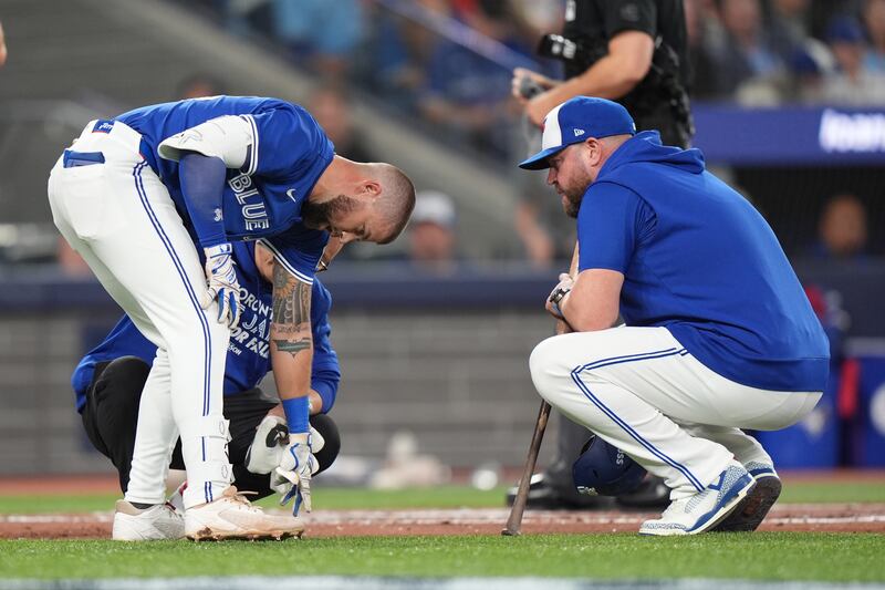 Lukes hit hard by a foul ball Toronto Blue Jays manager John Schneider, right, talks with Nathan Lukes after he was hits by the ball during first inning American League Championship Series baseball action against the Seattle Mariners in Toronto on Sunday, Oct. 12, 2025.