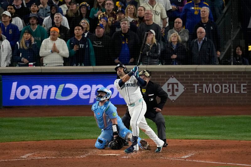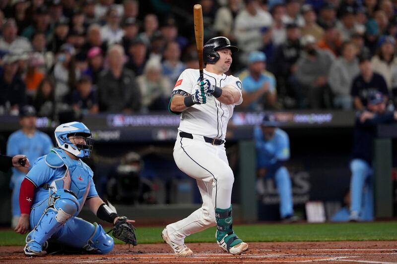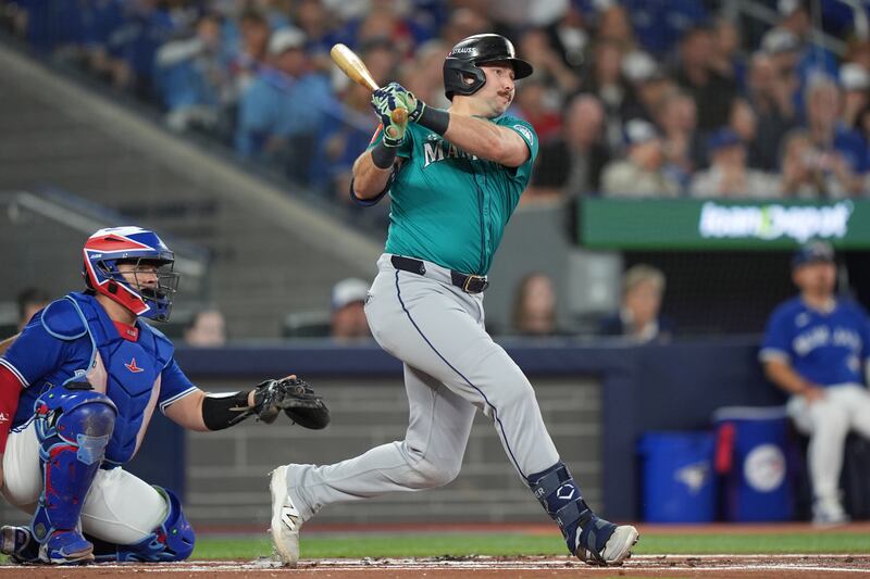 Raleigh responds Seattle Mariners' Cal Raleigh follows through on a double against the Toronto Blue Jays during the first inning in Game 5 of baseball's American League Championship Series, Friday, Oct. 17, 2025, in Seattle.