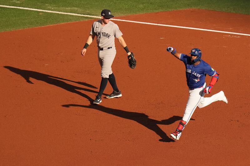 Blue Jays vs Yankees Toronto Blue Jays' Vladimir Guerrero Jr. (27) rounds first base past New York Yankees first baseman Ben Rice (22) after hitting a home run during the first inning of game 1 in MLB American League Division Series baseball action in Toronto on Saturday, October 4, 2025. THE CANADIAN PRESS/Chris Young