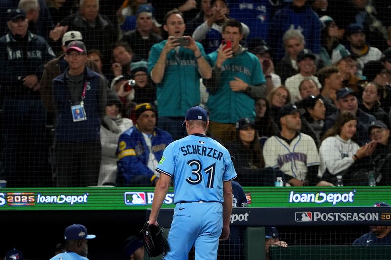 Scherzer ends his rowdy night Toronto Blue Jays pitcher Max Scherzer leaves the game during the sixth inning in Game 4 of baseball's American League Championship Series against the Seattle Mariners, Thursday, Oct. 16, 2025, in Seattle.