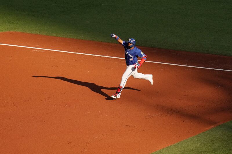 Vladimir Guerrero Jr. after hitting a homer in Game 3 Toronto Blue Jays' Vladimir Guerrero Jr. reacts as he rounds the bases after hitting a solo home run against the New York Yankees during the first inning of Game 3 of baseball's American League Division Series, Tuesday, Oct. 7, 2025, in New York. (AP Photo/Yuki Iwamura)