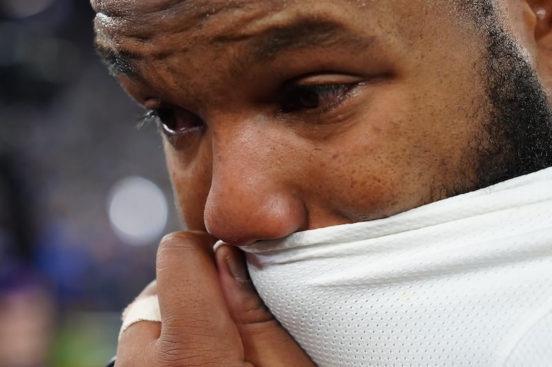 Blue Jays players looking dejected The Toronto Blue Jays watch from the dugout during the ninth inning in Game 1 of baseball's American League Championship Series against the Seattle Mariners, Sunday, Oct. 12, 2025, in Toronto.