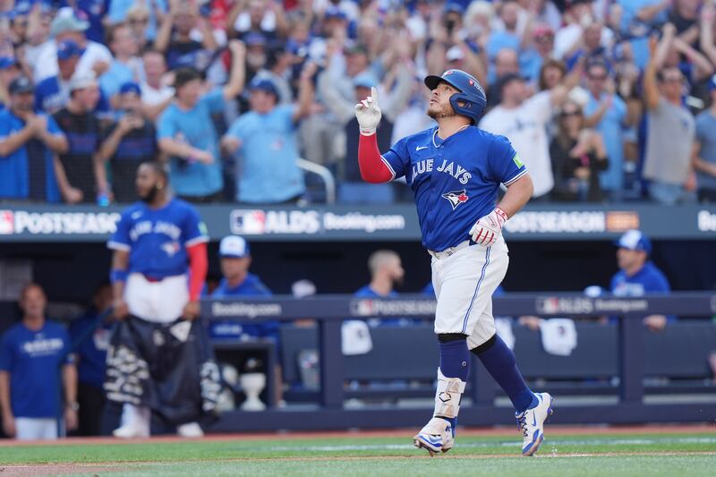 George Springer hits a solo 'dinger' Toronto Blue Jays right fielder George Springer (4) rounds the bases after hitting a solo home run against the Seattle Mariners during first inning American League Championship Series baseball action in Toronto on Sunday, Oct. 12, 2025.