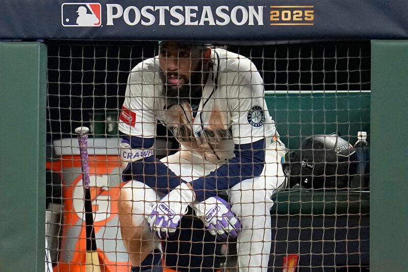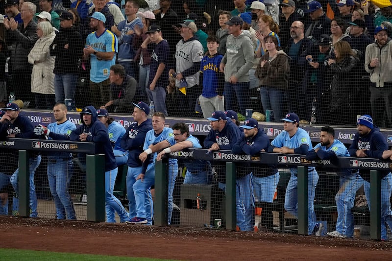 Mariners turn to look dejected from the dugout Seattle Mariners players watch from the dugout during the ninth inning in Game 4 of baseball's American League Championship Series against the Toronto Blue Jays, Thursday, Oct. 16, 2025, in Seattle.