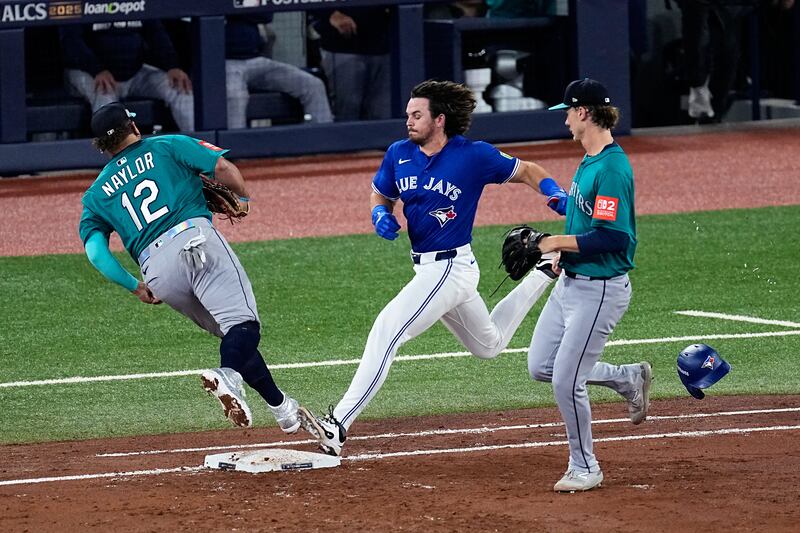 Barger misses out on 1st Seattle Mariners' Josh Naylor beats Toronto Blue Jays' Addison Barger to the base for the out during the third inning in Game 1 of baseball's American League Championship Series as Mariners pitcher Bryce Miller, right, watches, Sunday, Oct. 12, 2025, in Toronto.