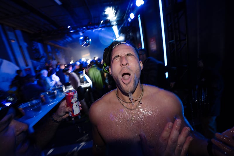 Blue Jays players down beer in the clubhouse Toronto Blue Jays' Daulton Varsho celebrates in the clubhouse after defeating the Seattle Mariners in MLB American League Championship Series game 7 baseball action in Toronto, Monday, Oct. 20, 2025.